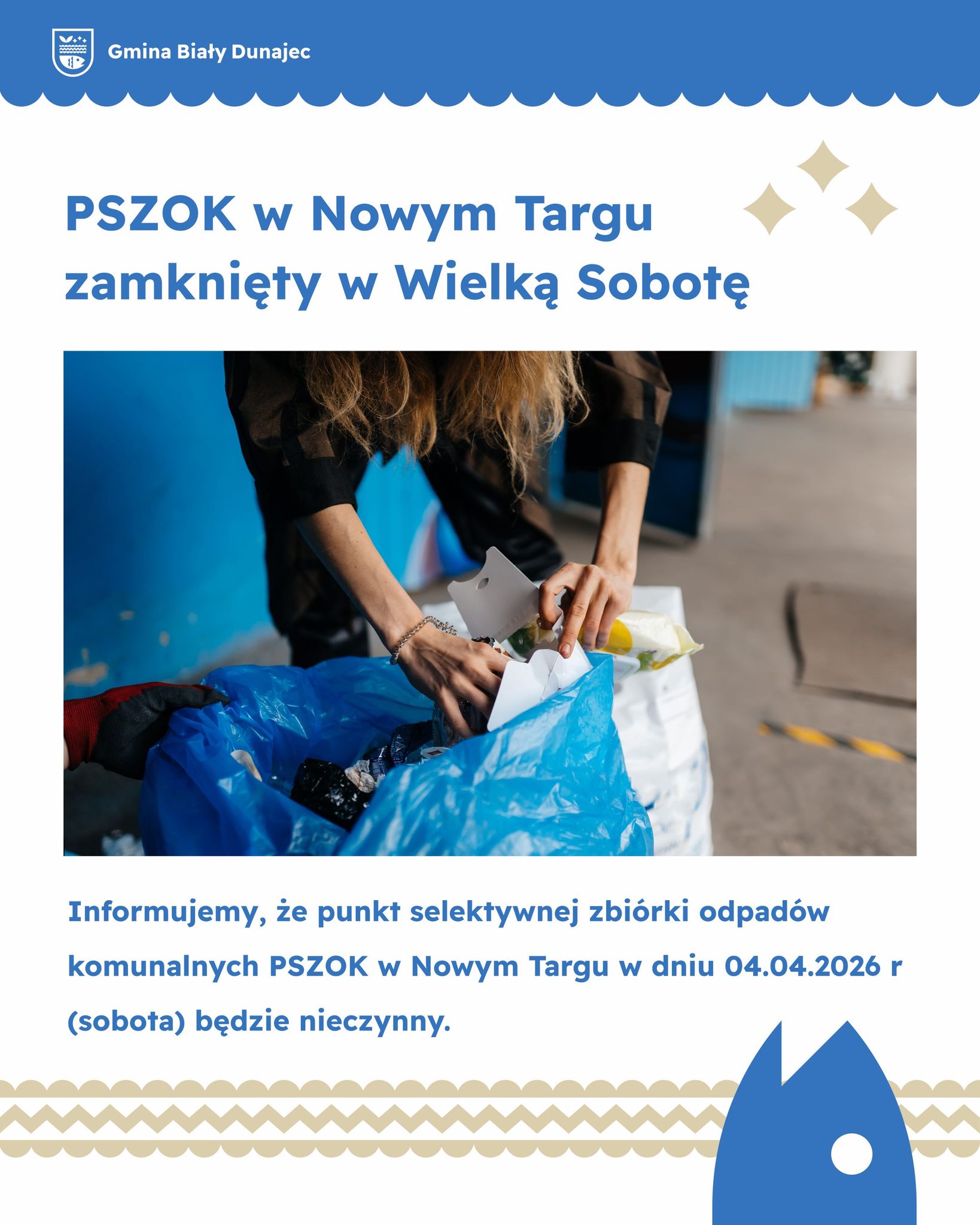 Informujemy, że Punkt Selektywnej Zbiórki Odpadów Komunalnych (PSZOK) w Nowym Targu w dniu 04.04.2026 r. (Wielka Sobota) będzie nieczynny.
