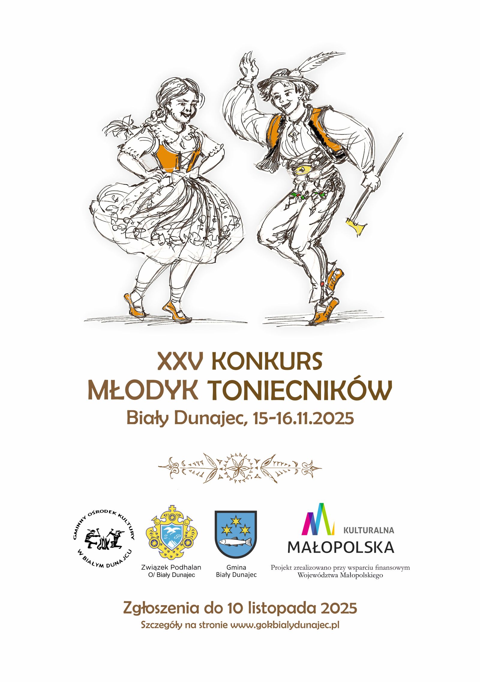 Gminny Ośrodek Kultury w Białym Dunajcu serdecznie zaprasza dzieci i młodzież tańczącą w podhalańskich zespołach regionalnych, a także osoby niezrzeszone do udziału w XXV Konkursie Młodyk Toniecników. Przesłuchania uczestników, podczas których oceniane będą taniec solowy oraz zbójnicki, odbędą się w dniach 15 i 16 listopada 2025 roku (sobota-niedziela) w Auli przy Szkole Podstawowej nr 1 w Białym Dunajcu (ul. Jana Pawła II 184a).
